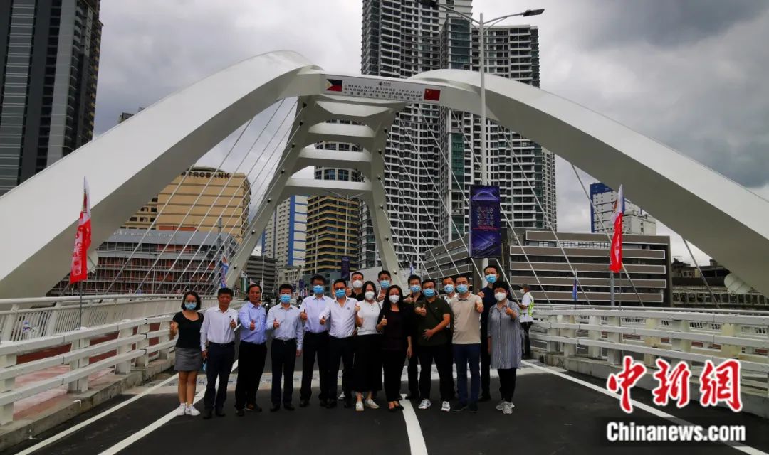 2022年4月6日,中國駐菲使館部分館員和中國駐菲企業、機構工作人員,登上新落成的中國援建菲律賓馬尼拉B-I大橋合影留念。中國駐菲律賓大使館 供圖