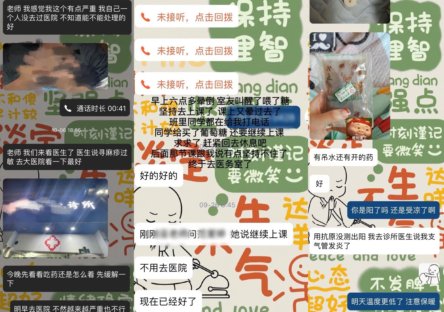 “因為我帶的學生基數較大,三百多人,每周基本上都會有十幾個因生病請假的學生。” 阿宛向中新網介紹,生病的學生中,最常見的是感冒發燒、胃疼等情況,也有一些突發狀況,比如“著急下樓收衣服結果被垃圾車刮到,半夜嘔吐到進醫院,低血糖在課上暈倒”等。