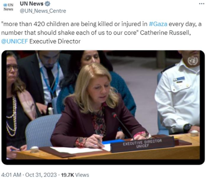 中新網10月31日電 據聯合國新聞消息,當地時間30日,聯合國兒童基金會執行主任凱瑟琳·拉塞爾表示,最新統計數據顯示,目前加沙地帶每天至少有420名兒童死亡和受傷。