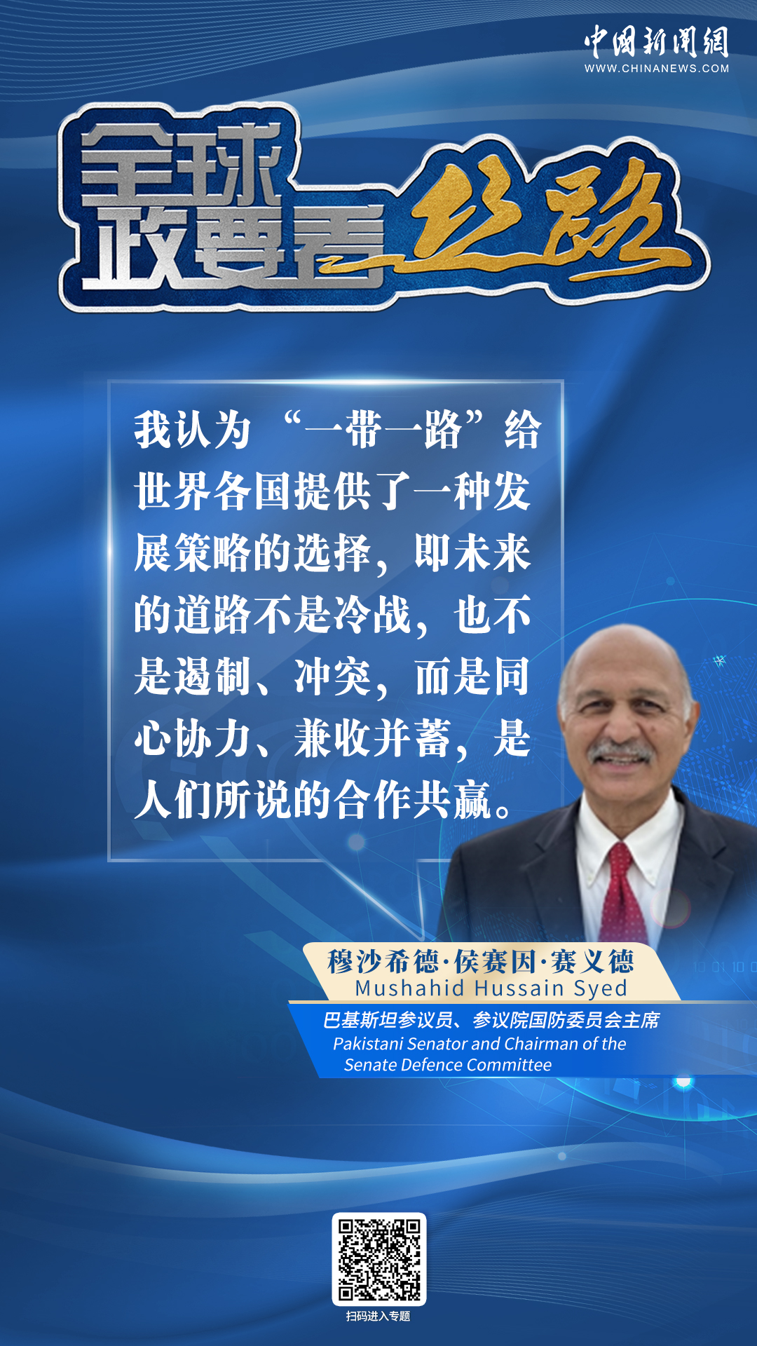 中新網10月28日電(張乃月) “‘一帶一路’給世界各國提供了一種發展策略的選擇,即未來的道路不是冷戰,也不是遏制、沖突,而是同心協力、兼收并蓄,是人們所說的合作共贏。”巴基斯坦參議員、參議院國防委員會主席穆沙希德·侯賽因·賽義德近日接受中新網專訪時如是說。
