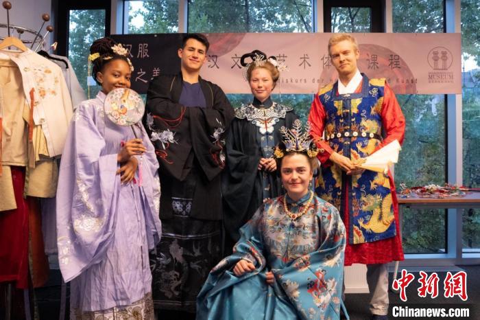圖為德國學生身著漢服參與漢文化體驗課程,學習漢服文化。漢文化藝術交流中心供圖