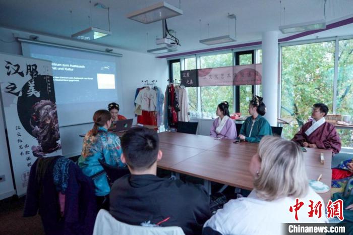 圖為活動講師為德國學生介紹漢制漢服特點。漢文化藝術交流中心供圖。