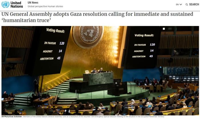 據(jù)聯(lián)合國網(wǎng)站消息,紐約當(dāng)?shù)貢r間27日下午,第78屆聯(lián)大以125票贊成、14票反對和45票棄權(quán)的表決結(jié)果,通過了由約旦代表阿拉伯國家集團提交的一份聯(lián)大決議草案。