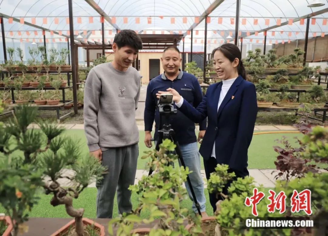 午后,在“中國盆景淘寶第一村”新河鎮周圈村,花農姜愛花忙著給一株刺柏“盛裝打扮”,晚上,這株刺柏會被送往該村的“花木集市”,數十名主播將對其直播競拍。