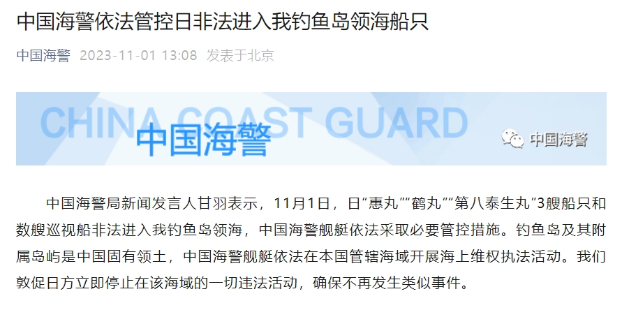 中新網11月1日電 據中國海警微博消息,中國海警局新聞發言人甘羽表示,11月1日,日“惠丸”“鶴丸”“第八泰生丸”3艘船只和數艘巡視船非法進入我釣魚島領海,中國海警艦艇依法采取必要管控措施。釣魚島及其附屬島嶼是中國固有領土,中國海警艦艇依法在本國管轄海域開展海上維權執法活動。我們敦促日方立即停止在該海域的一切違法活動,確保不再發生類似事件。