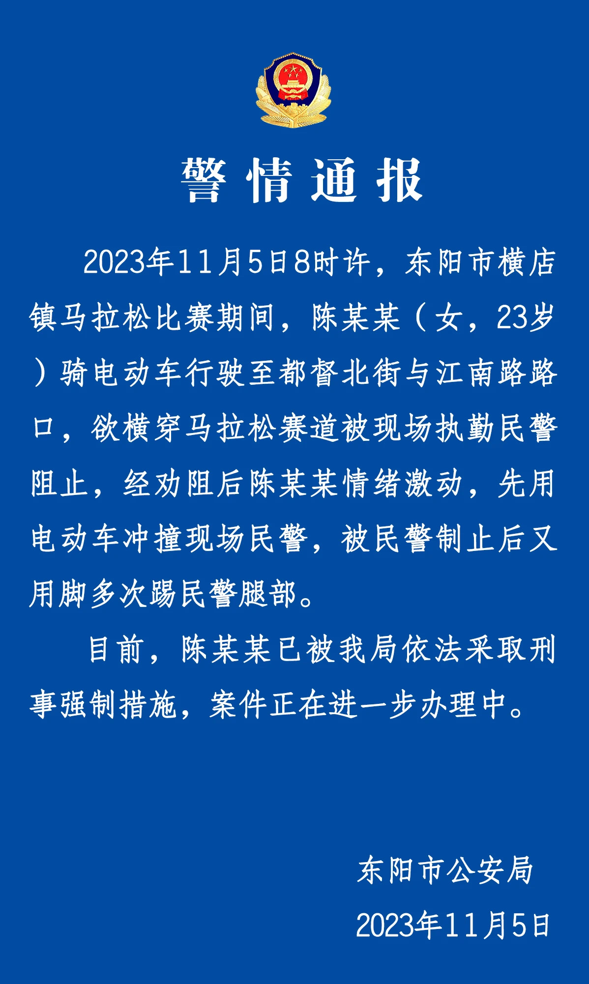 中新網金華11月6日電(董易鑫)浙江金華東陽市公安局11月5日發布警情通報稱,2023年11月5日8時許,東陽市橫店鎮馬拉松比賽期間,陳某某(女,23歲)騎電動車行駛至都督北街與江南路路口,欲橫穿馬拉松賽道被現場執勤民警阻止,經勸阻后陳某某情緒激動,先用電動車沖撞現場民警,被民警制止后又用腳多次踢民警腿部。
