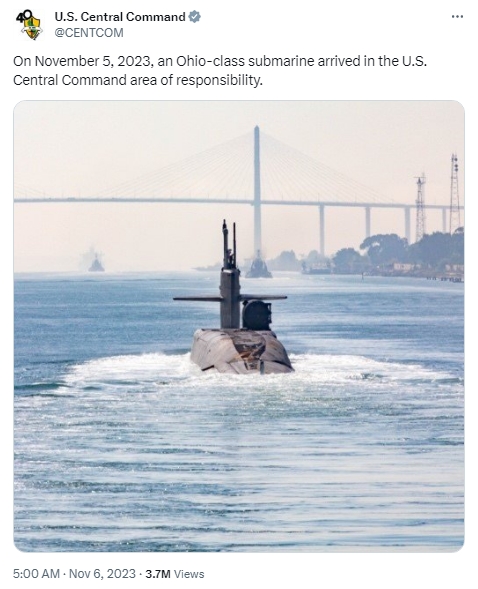 據報道,當天,美國中央司令部在社交媒體上發帖稱,“11月5日,一艘‘俄亥俄’級戰略潛艇抵達中東地區。”