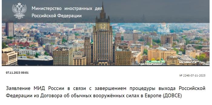 當地時間11月7日,俄羅斯外交部發布關于俄羅斯完成退出《歐洲常規武裝力量條約》程序的聲明。圖片來源:俄羅斯外交部網站