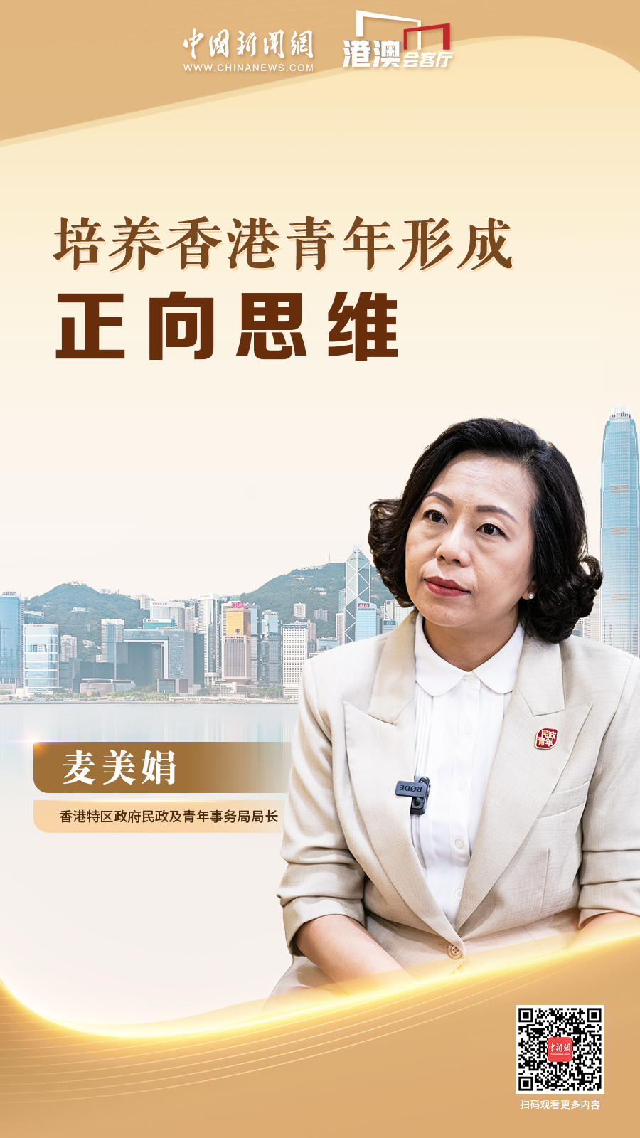 香港特區(qū)政府民政及青年事務(wù)局局長麥美娟近日接受中國新聞網(wǎng)“港澳會客廳”欄目專訪時表示,要培養(yǎng)香港青年形成正向思維。