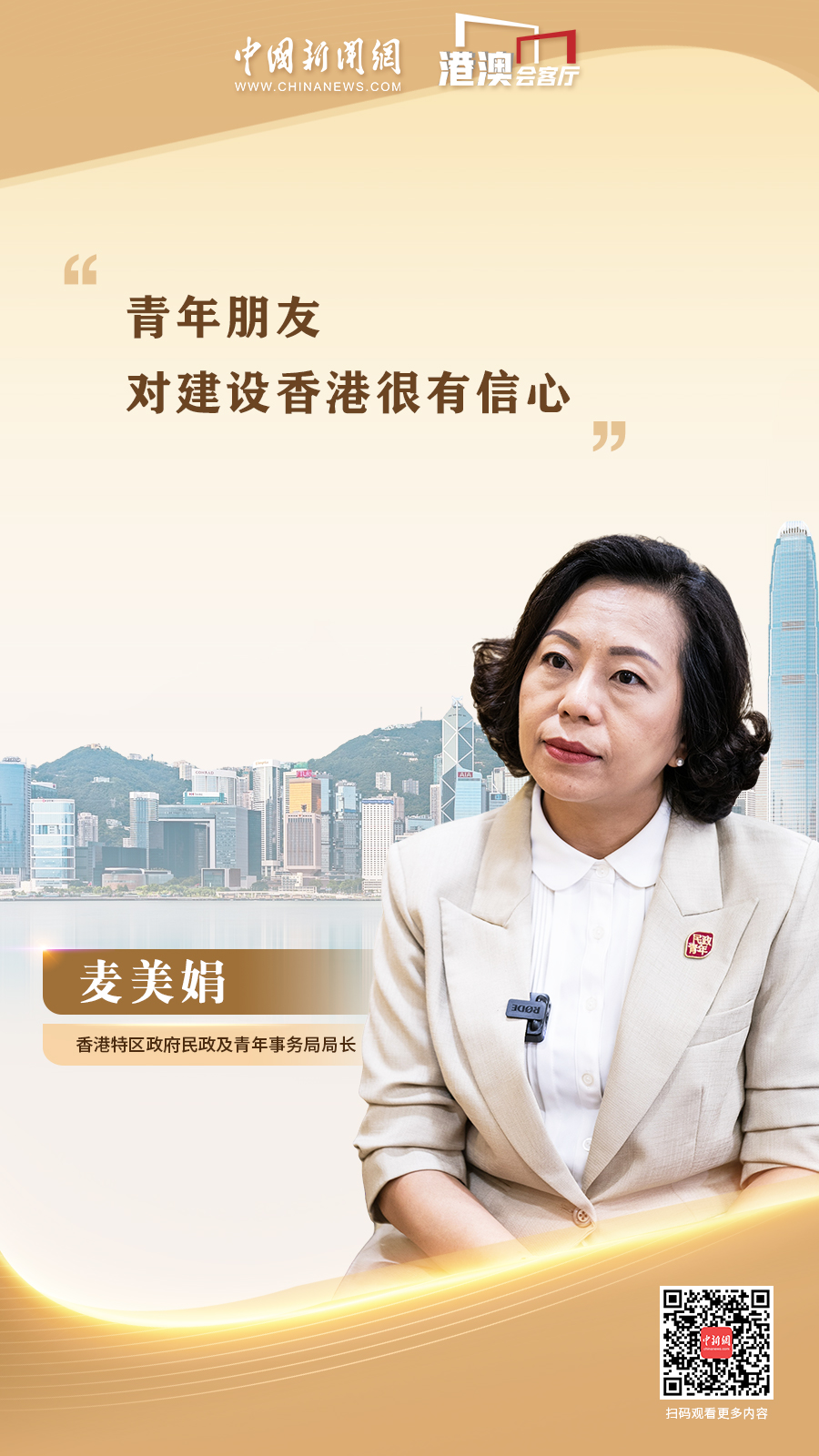 香港特區(qū)政府民政及青年事務(wù)局局長麥美娟近日接受中國新聞網(wǎng)“港澳會客廳”欄目專訪時表示,青年朋友對建設(shè)香港很有信心。