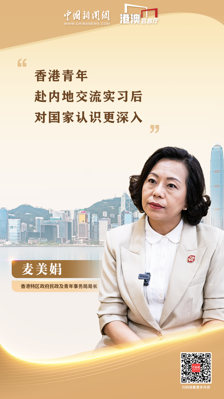 香港與內(nèi)地全面恢復(fù)人員往來后,民青局出臺了哪些政策、組織了哪些活動幫助香港青年融入國家發(fā)展大局?未來的民政及青年工作有哪些重點?麥美娟近日接受中國新聞網(wǎng)“港澳會客廳”欄目專訪,對這些問題一一作答。