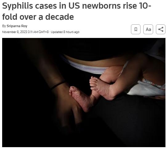 據(jù)報道,當(dāng)天,美國疾病控制和預(yù)防中心報告顯示,2012年新生兒梅毒病例僅為330多例2022年這一數(shù)字升至3761例,增長了10倍多,為30多年來最高值。