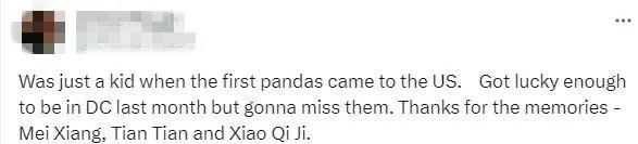 有網友回憶起與大熊貓的點滴時說,“當第一批大熊貓們來到美國時,我還只是個孩子。上個月很幸運能前往華盛頓,我會想念它們的。謝謝你們帶來的回憶——美香、添添和小奇跡。”