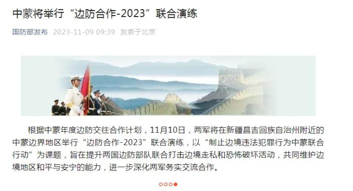 中新網11月9日電 據國防部發布微信公眾號消息,根據中蒙年度邊防交往合作計劃,11月10日,兩軍將在新疆昌吉回族自治州附近的中蒙邊界地區舉行“邊防合作-2023”聯合演練,以“制止邊境違法犯罪行為中蒙聯合行動”為課題,旨在提升兩國邊防部隊聯合打擊邊境走私和恐怖破壞活動,共同維護邊境地區和平與安寧的能力,進一步深化兩軍務實交流合作。