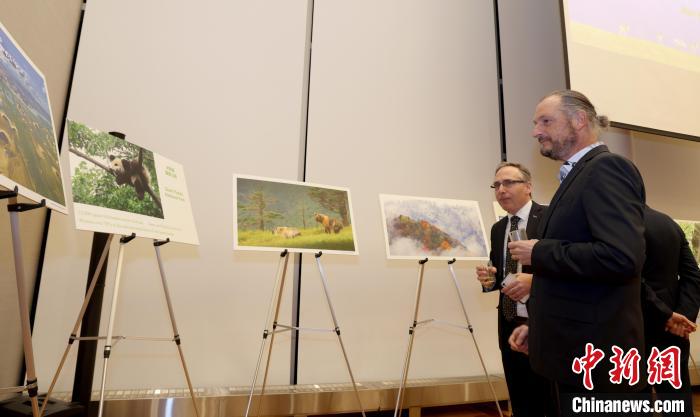 當?shù)貢r間11月8日,中國駐加拿大使館舉辦國家公園圖片展暨招待會。圖為與會嘉賓觀看大熊貓國家公園照片。中新社記者 余瑞冬 攝