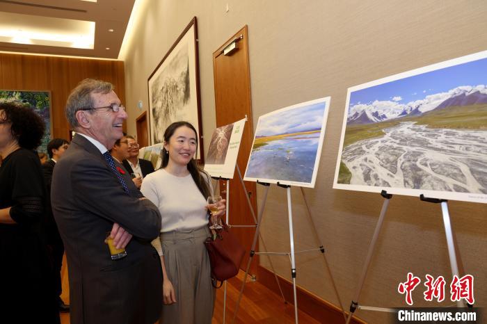 當?shù)貢r間11月8日,中國駐加拿大使館舉辦國家公園圖片展暨招待會。圖為與會嘉賓觀看三江源國家公園照片。 中新社記者 余瑞冬 攝