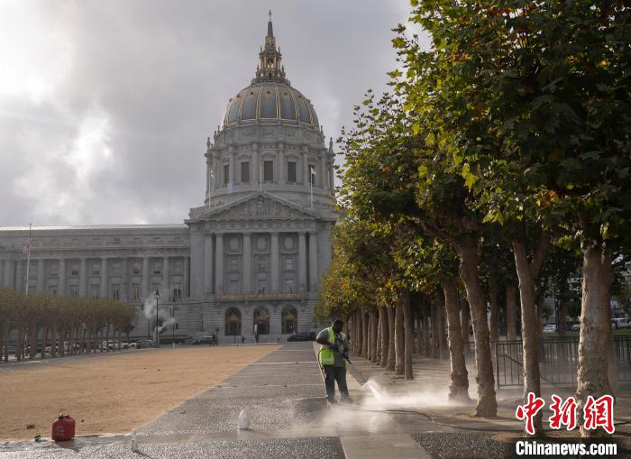 當地時間11月6日,工作人員在舊金山市政廳前的市政中心廣場清潔地面。 中新社記者 劉關關 攝