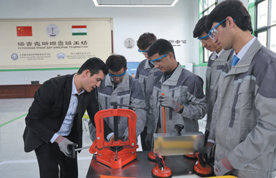 2022年,中亞地區首家魯班工坊在塔吉克斯坦啟動運營,為塔吉克斯坦開展職業培訓作出了積極貢獻。圖為今年4月,在塔吉克斯坦魯班工坊,塔方教授向學生介紹中方捐贈的設備。