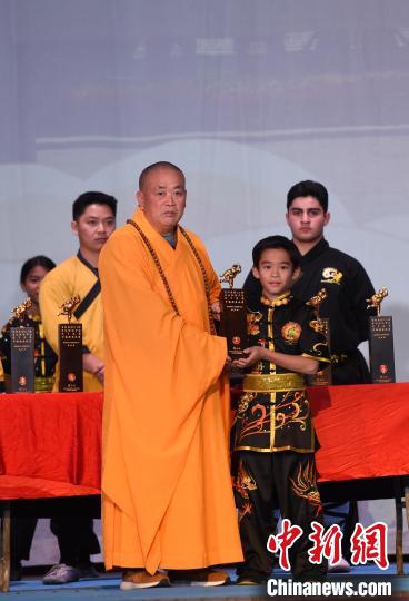 當地時間11月12日下午,由中國嵩山少林寺主辦的“不朽少林”少林功夫公演在已有逾百年歷史的美國洛杉磯Million Dollar劇院舉行。圖為嵩山少林寺方丈釋永信向“北美洲少林考功大賽”獲獎者頒獎。 中新社記者 張朔 攝