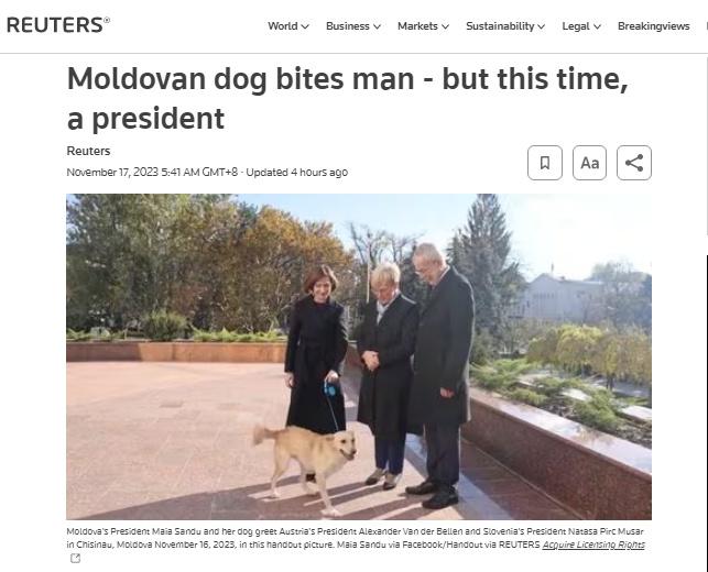 中新網11月17日電 據路透社援引摩爾多瓦媒體消息,當地時間16日,摩爾多瓦總統桑杜的愛犬在總統官邸咬傷了到訪的奧地利總統范德貝倫。