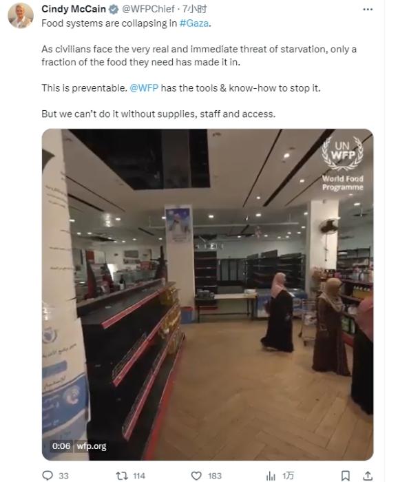世界糧食計劃署發文表示,自新一輪沖突開始以來,進入加沙的糧食只能滿足該地區百分之十的需求,加沙地帶現在面臨著巨大的糧食缺口和普遍的饑餓威脅。