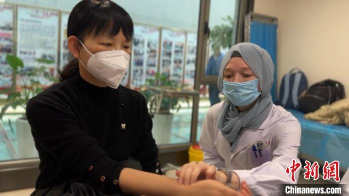 11月中旬,李峰的妻子瑪麗亞(右),作為甘肅中醫藥大學附屬醫院俄羅斯實習生,為甘肅患者把脈。王牧雨 攝