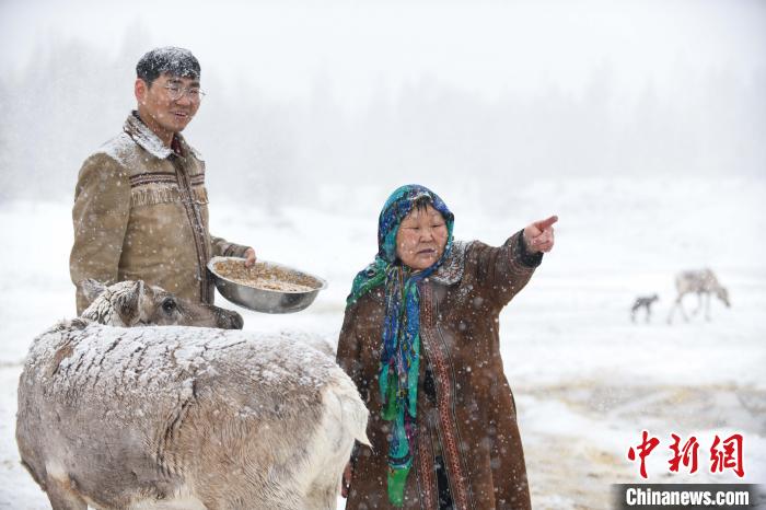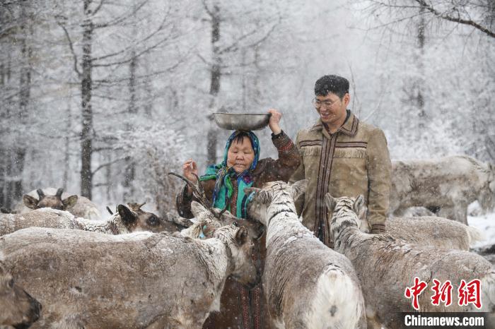 資料圖。圖為2023年4月29日,在內(nèi)蒙古大興安嶺,柳霞與兒子雨果在雪中給馴鹿喂食豆餅。 王偉 攝