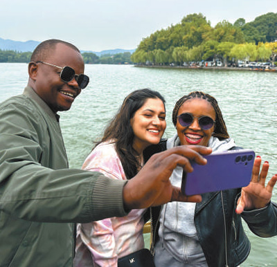 10月13日,代表團成員在浙江省杭州市西湖景區(qū)合影留念。