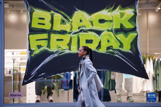 11月22日,在英國曼徹斯特,一名女子走過“黑色星期五”促銷廣告。新華社發(喬恩·休珀攝)