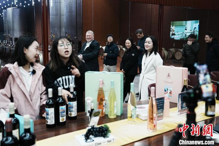 澳大利亞駐華大使館公使銜參贊樊思明(左三)被賀蘭神酒莊工作人員直播帶貨的場景吸引。中新網記者 崔楠 攝