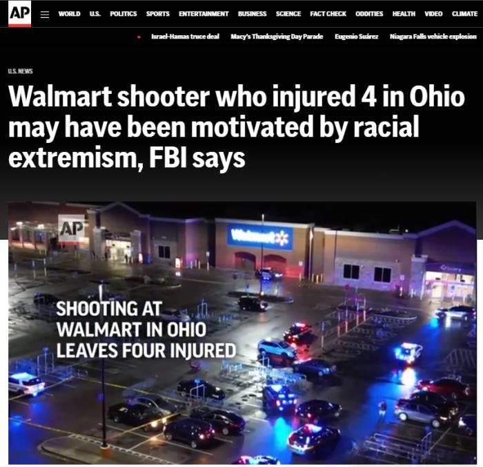 FBI稱,當地時間20日晚上,美國俄亥俄州代頓市郊區的一家沃爾瑪發生槍擊事件,四名購物者受傷,包括兩名黑人女性、一名白人女性和一名白人男性。