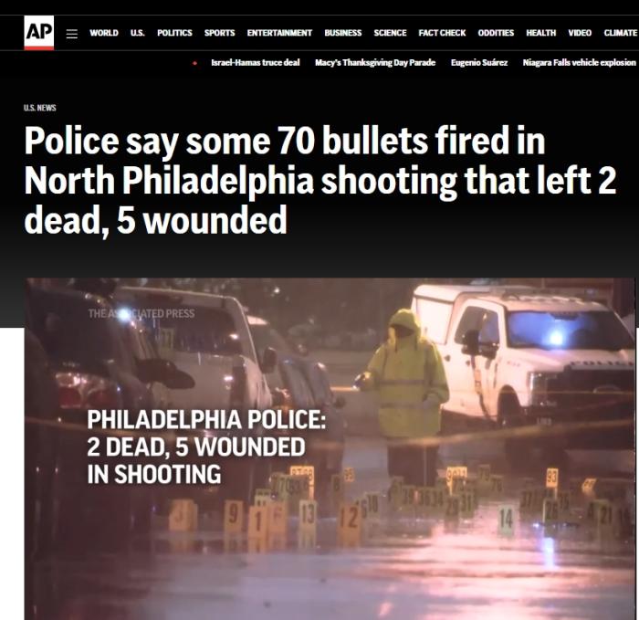 中新網11月23日電 據美聯社報道,當地時間21日,美國費城北部發生槍擊事件。當地警方22日確認,槍手至少發射了70發子彈,導致2名男子喪生,另有5人受傷。目前,警方還未逮捕嫌疑人。