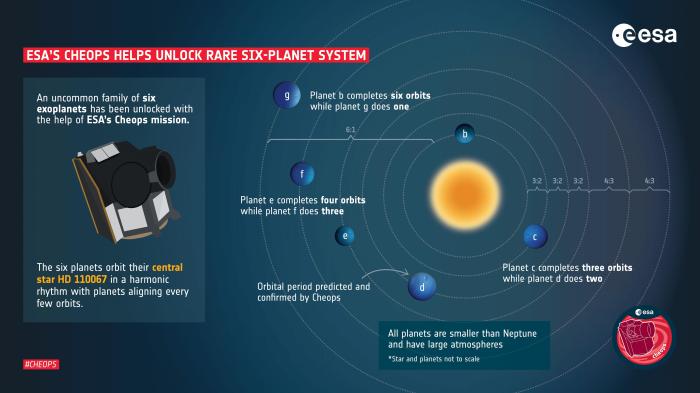 這次研究發現的一個由6顆系外行星組成的系統,這個家族中的行星都比海王星小,它們圍繞著HD110067跳著精確的“華爾茲”。(圖片來自歐洲空間局)。施普林格·自然 供圖