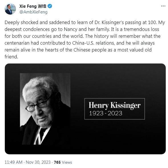 謝鋒寫道,“得知基辛格博士去世,享年100歲,我深感震驚和悲痛。我向南希(基辛格夫人)以及她的家人致以最深切的哀悼。這對我們(中美)兩國和世界來說都是巨大的損失。歷史將銘記這位百歲老人為中美關系作出的貢獻,他將作為最珍貴的老朋友,永遠活在中國人民心中。”