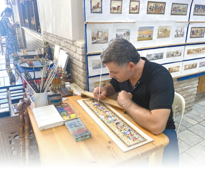 一名畫師在布哈拉一處集市內創作有關古絲綢之路的畫作。