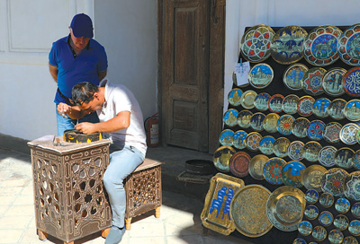 在布哈拉雅克城堡內,手工藝人正在制作極具當地特色的手工藝品。