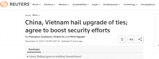 中國日報網(wǎng)12月14日電 12月12日,中國和越南共同宣布中越兩黨兩國關(guān)系新定位,在深化中越全面戰(zhàn)略合作伙伴關(guān)系基礎(chǔ)上,攜手構(gòu)建具有戰(zhàn)略意義的中越命運共同體。國際媒體對中越關(guān)系新定位進行了密集報道,認為雙邊關(guān)系更加重要,中越兩黨兩國關(guān)系邁上新臺階。
