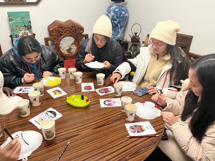 參觀完天壇之后,活動的下一站是在老北京胡同里體驗戲劇臉譜繪制。在了解臉譜文化的起源與發展后,留學生們紛紛對“紅臉關公” “白臉曹操”感到新奇,大家迫不及待地圍坐在小桌前,一筆一劃地勾勒出屬于自己的臉譜,一個個惟妙惟肖。