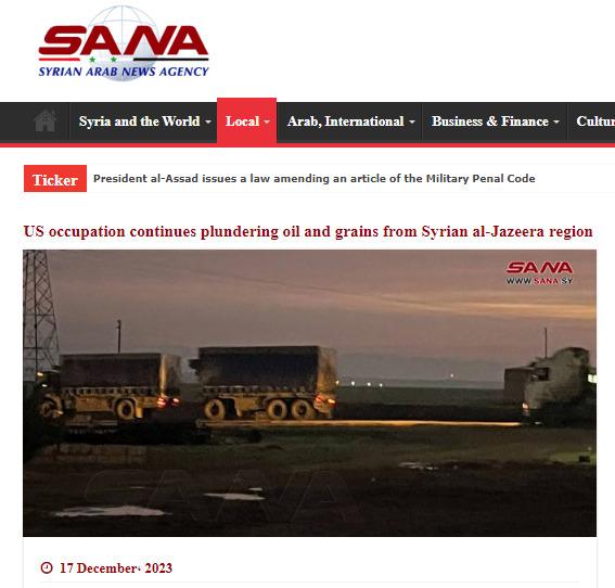 報道還稱,這是“美國在敘非法駐軍掠奪敘利亞國家財富系統性計劃的一部分”。