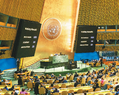 2023年12月12日,聯(lián)合國大會(huì)緊急特別會(huì)議投票通過決議,要求在加沙地帶立即實(shí)現(xiàn)人道主義停火。圖為會(huì)議投票現(xiàn)場(chǎng)。