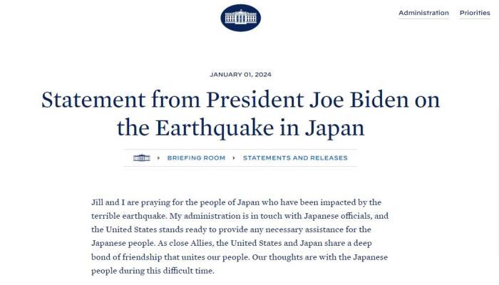 聲明稱,美國(guó)總統(tǒng)拜登和第一夫人吉爾“正在為遭受可怕地震影響的日本人民祈禱。拜登政府正與日本官員保持聯(lián)系,美國(guó)隨時(shí)準(zhǔn)備為日本民眾提供任何必要的援助。”