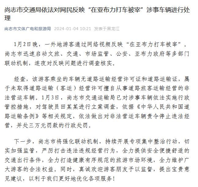 經查,該游客乘坐的車輛無道路運輸經營許可證和道路運輸證,屬于未取得道路運輸(客運)經營許可擅自從事道路旅客運輸經營的非法營運車輛。1月3日,尚志市交通運輸局已對涉事車輛依法實施行政管控措施,對駕駛員田某某進行立案調查,依據《中華人民共和國道路運輸條例》等相關規定,依法做出對非法營運車輛責令停止違法經營,并處三萬元罰款的行政處罰。
