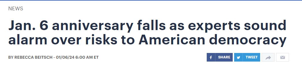 這項民調結果公布之時,正值“國會山騷亂”事件三周年之際,美國也迎來新的選舉年。《國會山報》網站在6日的報道中再次提到,目前美國出現了一系列與民主狀況有關的令人不安的跡象。