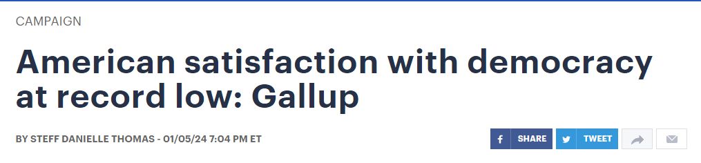 中國日報網1月8日電 據美國《國會山報》網站5日報道,蓋洛普公司(Gallup)5日公布的民調顯示,只有28%的美國成年人對該國的民主現狀感到滿意,較2021年1月6日美國“國會山騷亂”事件發生后不久的35%的調查結果又有了明顯的下降,創歷史新低。