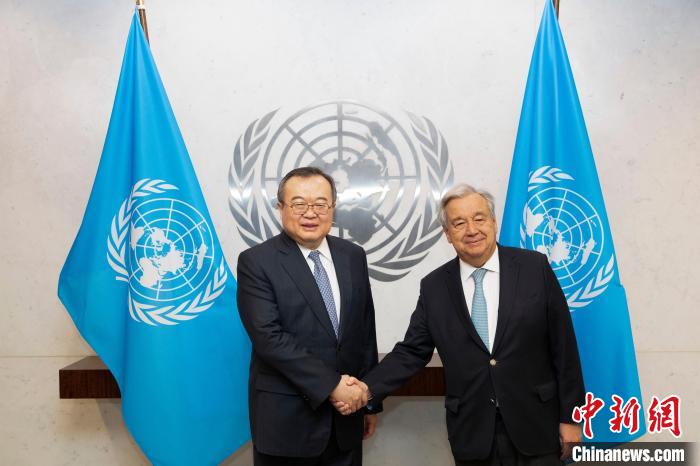 當地時間1月9日,中共中央對外聯絡部部長劉建超在紐約聯合國總部會見聯合國秘書長古特雷斯,就中國同聯合國合作、全球文明倡議以及雙方共同關心的國際和地區問題交換看法。 中新社記者 廖攀 攝