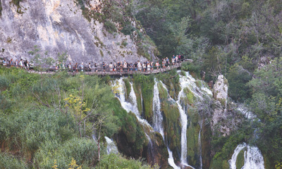 克羅地亞普利特維采湖國家公園是中國九寨溝國家級自然保護區(qū)的“姐妹”自然遺產(chǎn)地。兩者同屬喀斯特地貌,是世界非常罕見的冷水鈣華景觀。中國科學院成都生物研究所與克羅地亞薩格勒布大學合作成立“中國—克羅地亞生物多樣性和生態(tài)系統(tǒng)服務‘一帶一路’聯(lián)合實驗室”,為兩國世界自然遺產(chǎn)地生態(tài)保育作出重要貢獻。圖為當?shù)赜慰驮谄绽鼐S采湖國家公園參觀。
