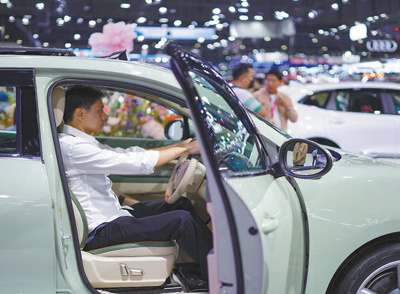 在2023年舉辦的第四十屆泰國國際汽車博覽會上,中國品牌電動汽車訂單量在所有參展品牌中名列前茅。在中國品牌的強勁拉動下,參展電動汽車訂單量首次超越燃油汽車訂單量。圖為當?shù)貐⒂^者在車博會上試駕中國品牌電動汽車。