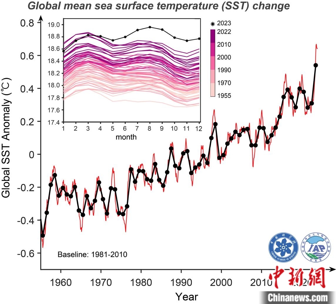 根據IAP/CAS溫度數據產品(1米層)分析的1955年至2023年12月全球平均海表溫度變化。黑線為年均值,紅色為月均值;異常值為相對于1981-2010年常年值;左上角內框為海表溫度的季節變化。中國科學院大氣物理研究所/供圖