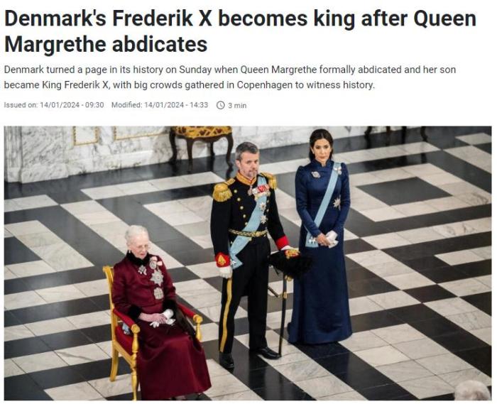 當(dāng)天早些時候,丹麥女王瑪格麗特二世宣布退位?,敻覃愄囟莱錾?940年,于1972年繼位。她于2023年12月31日發(fā)表新年致辭時宣布了退位消息。