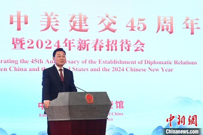 當地時間1月16日,中國駐美大使謝鋒在華盛頓舉辦的紀念中美建交45周年暨新春招待會上致辭。中新社記者 陳孟統 攝